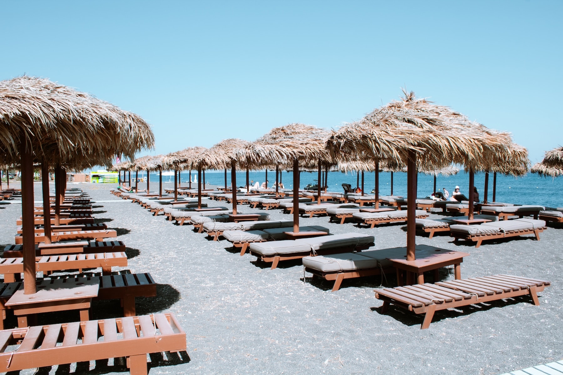 Pour une ambiance plus animée en bord de mer, direction Perivolos, au sud de l’île. Cette plage de sable noir fin est idéale pour alterner entre détente, baignade et déjeuner en terrasse. Bordée de bars de plage, de tavernes stylées et de petits hôtels, elle mêle parfaitement confort et ambiance décontractée. Ici, on sirote un cocktail les pieds dans le sable, on se baigne dans une eau calme, et on profite pleinement du soleil grec.