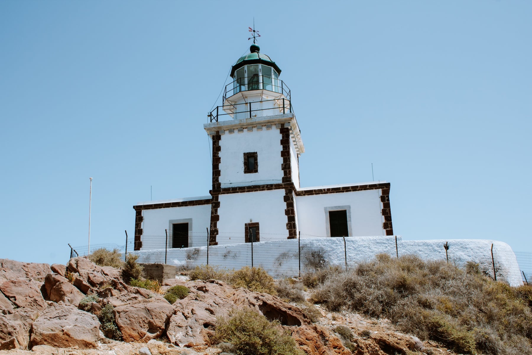 Situé à l’extrémité sud-ouest de l’île, le phare d’Akrotiri offre l’un des points de vue les plus spectaculaires de Santorin. Perché au sommet d’une falaise battue par les vents, ce petit phare blanc fait face à l’immensité de la mer Égée et à la majestueuse caldeira.