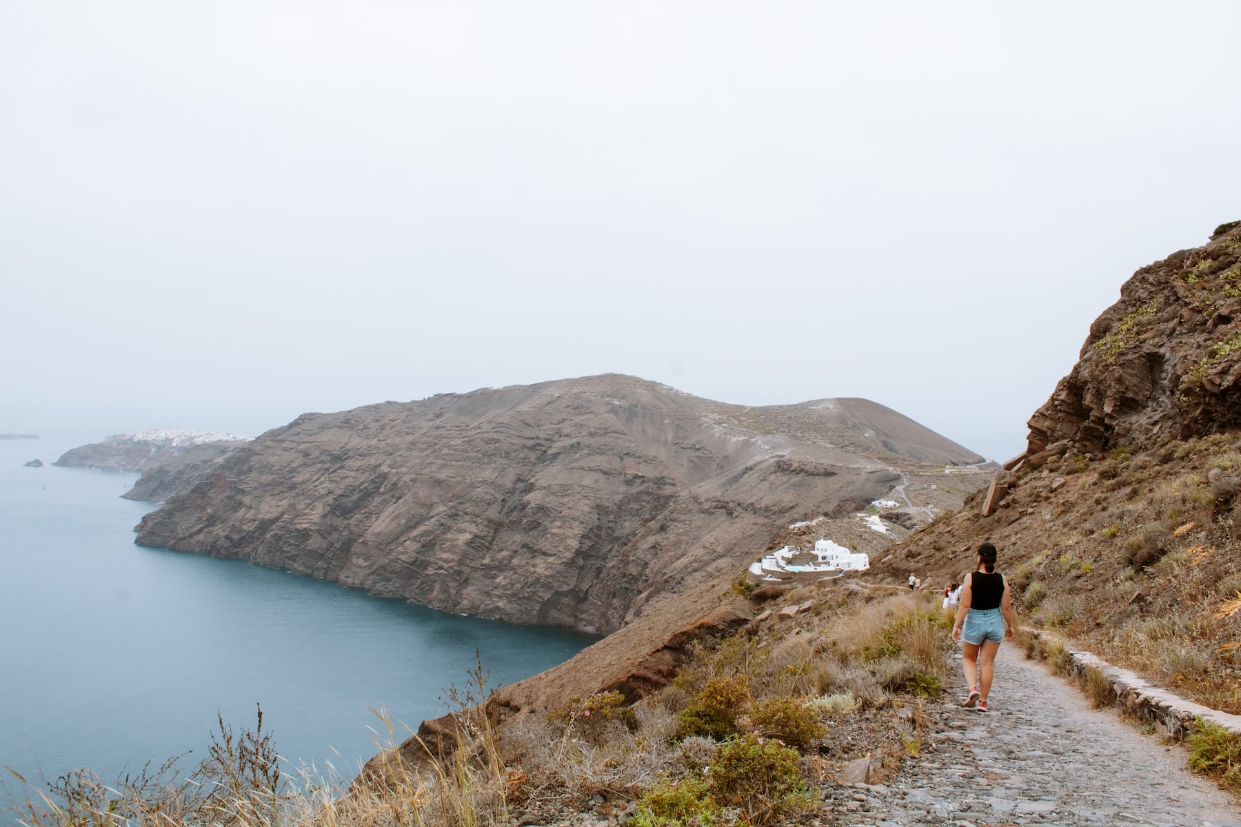 Le départ se fait depuis Fira, en suivant les panneaux qui indiquent « Oia ». Le chemin longe les villages de Firostefani et Imerovigli, puis serpente entre rochers volcaniques, chapelles blanches isolées et vues panoramiques à couper le souffle. Le parcours est assez plat dans l’ensemble, mais quelques montées sont à prévoir, surtout sous le soleil.